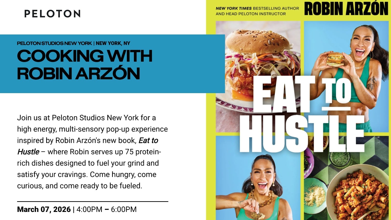 Peloton will host a “Cooking with Robin Arzón” event at PSNY on March 7, 2026 to celebrate Robin’s new cookbook Eat to Hustle. The event includes a conversation with Robin, an instructor cook-off, meet-and-greet, and a signed copy of the book.