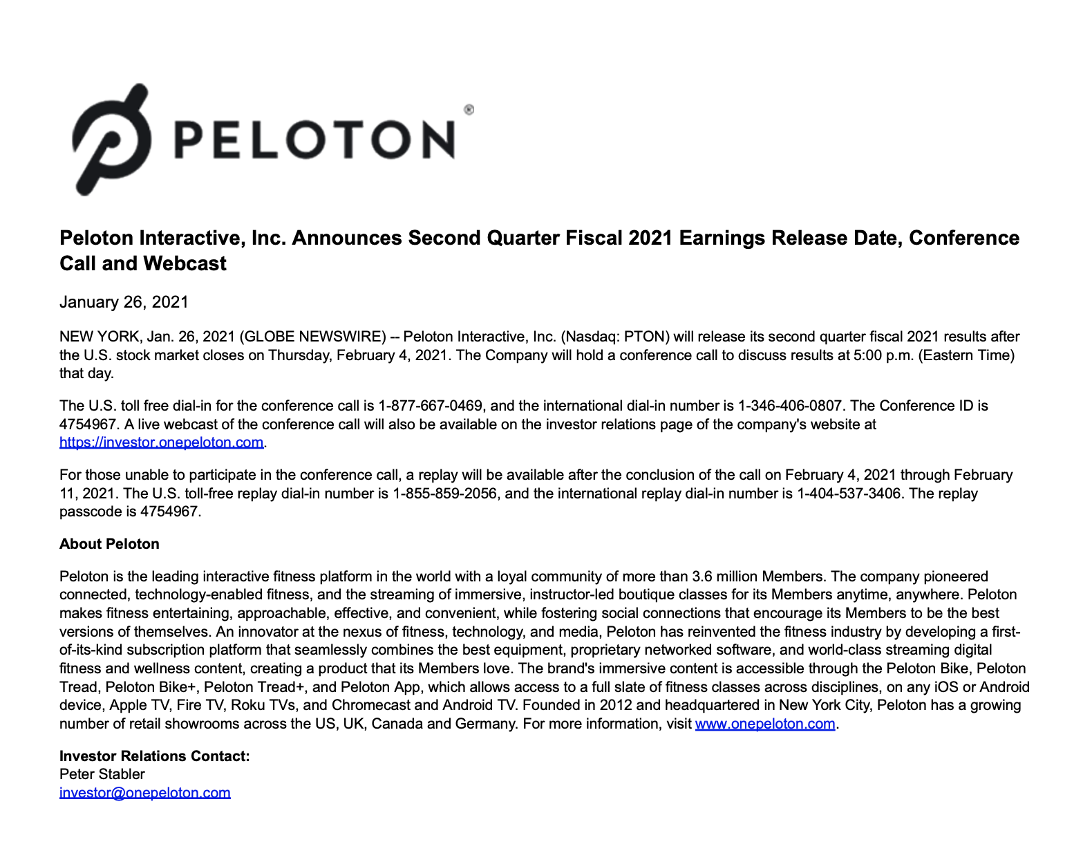 Peloton has announced their Q2 2021 earnings call will take place on Thursday, February 4th, 2021 @ 5:00pm ET.