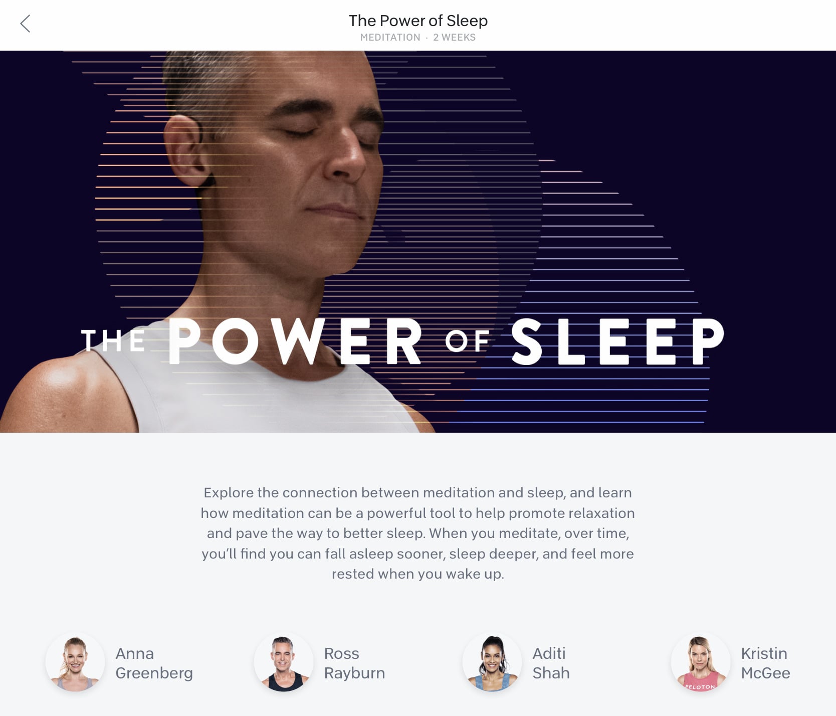Peloton has launched a “Power of Sleep” meditation program. Ross Rayburn, Aditi Shah, Kristin McGee and Anna Greenberg guide you on how to get more restful sleep.