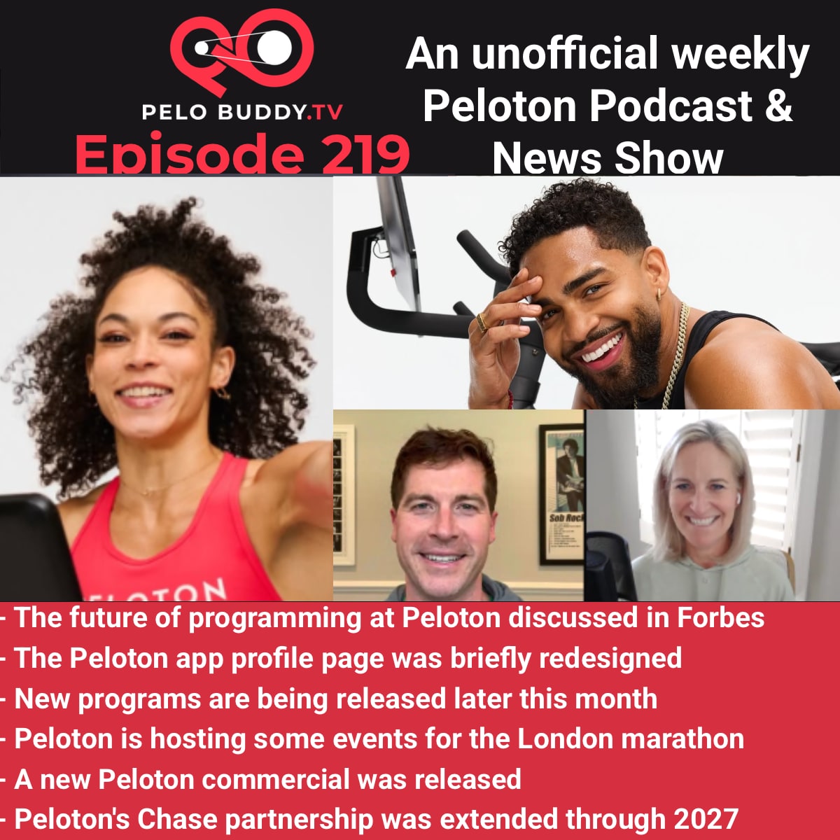 Episode 219 of Pelo Buddy TV, a Peloton podcast & Peloton news show. Top stories are the future of programming at Peloton, the Chase partnership extended, the Peloton app profile redesigned & more.