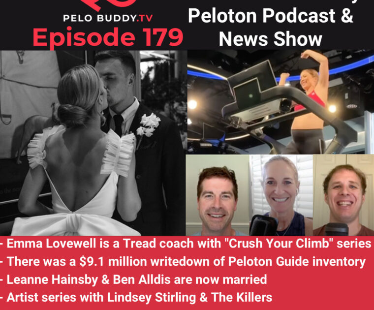 Episode 179 of Pelo Buddy TV, a Peloton podcast & Peloton news show. Top stories are Emma Lovewell on Tread, Peloton Guide inventory writedown, Ben & Leanne are married & more.