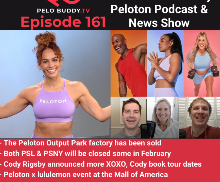 Episode 161 of Pelo Buddy TV, a Peloton podcast & Peloton news show. Top stories the Peloton Output Park factory was sold, a Peloton x lululemon event coming up, more Cody Rigsby book tour dates & more.