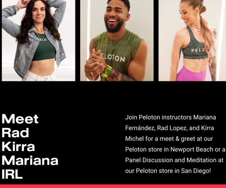 Meet & Greet Events with Peloton Instructors Rad Lopez, Kirra Michel, and Mariana Fernández in Newport Beach and San Diego, California on December 6-7, 2023