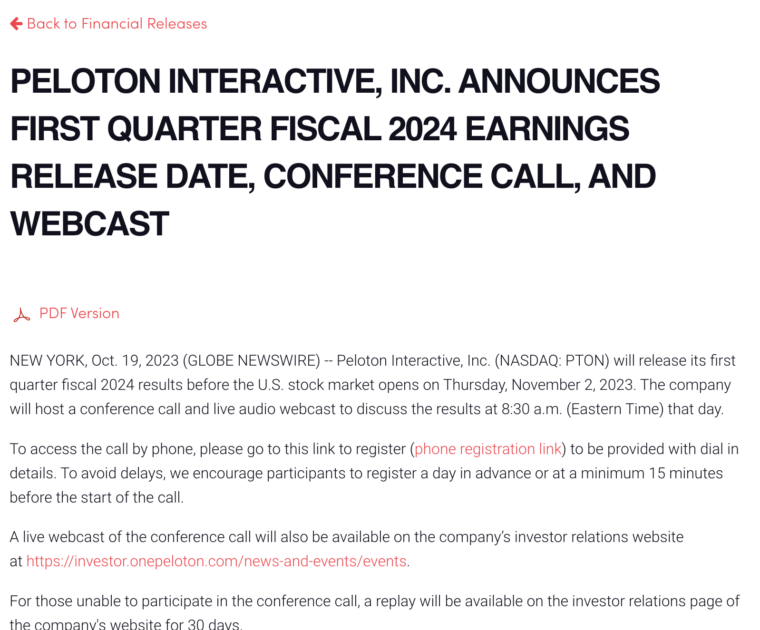 Peloton Q1 2024 Earnings Call Date Announced for November 2nd 2023