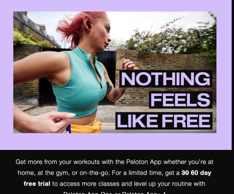 Peloton is offering an extended 60 day free trial for the Peloton App One and Peloton App+ through October 31, 2023.