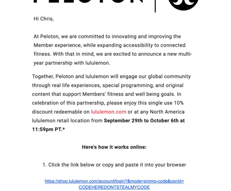 Peloton is emailing members a one time use lululemon discount redeemable through October 6, 2023 as part of the new partnership between the two companies.