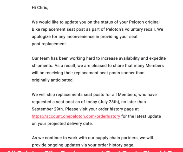 Peloton has said that all members who ordered a replacement Peloton Bike seat post as of today should see their seat post ship by September 29, 2023.