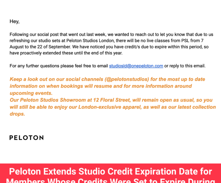 Peloton has proactively extended studio credits for members whose credits were scheduled to expire during the upcoming Peloton Studios London (PSL) closure.