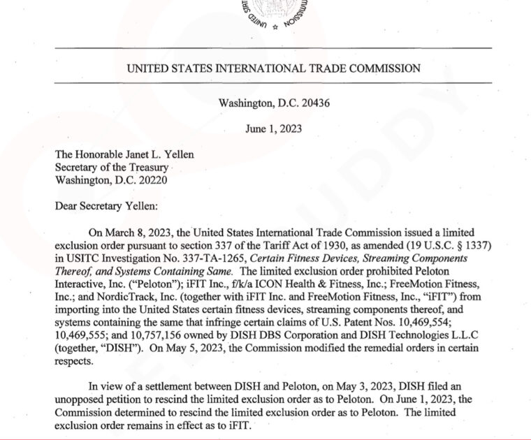 US ITC Officially Rescinds Import Ban Order Against Peloton from DISH lawsuit