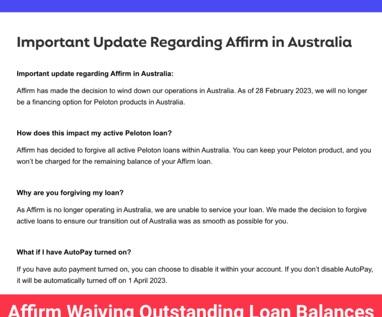 Affirm is waiving the balance of outstanding loans for Peloton members in Australia as they terminate operations in the country.