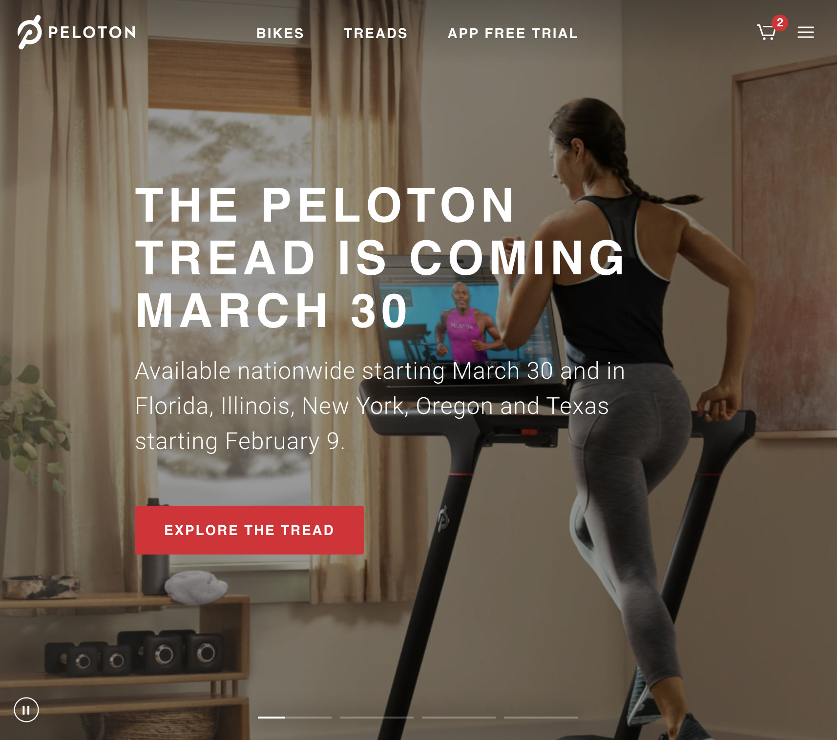 Peloton announced that the new lower cost Tread will be available on February 9th in Florida, Illinois, New York, Oregon, Texas, and across Canada. It will be available nationwide in the US on March 30th.
