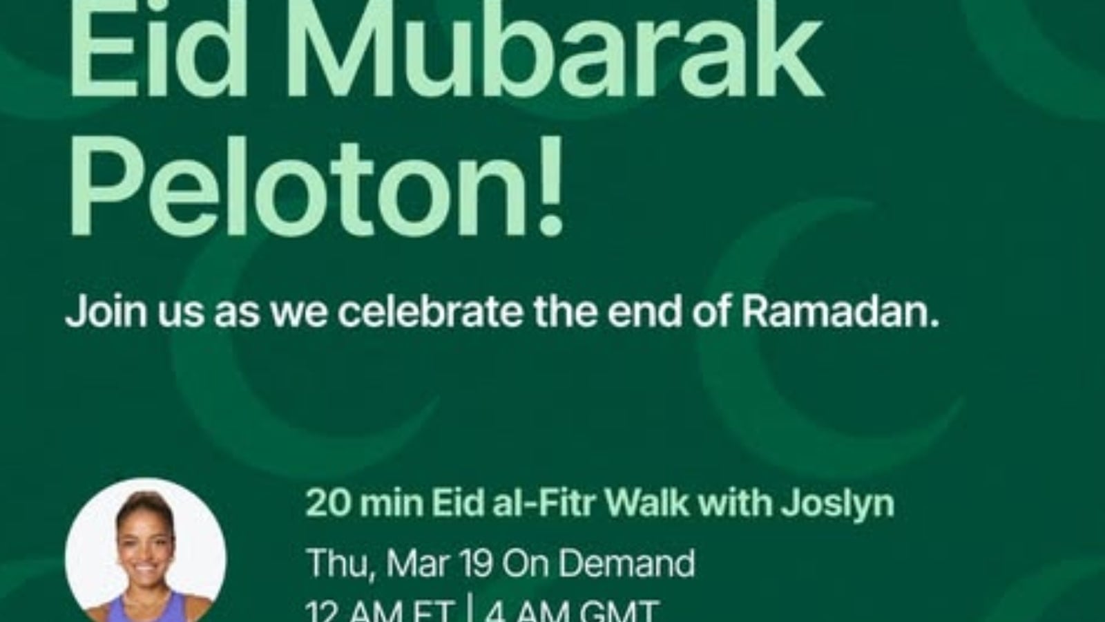 Peloton is celebrating Eid al-Fitr 2026 with two on-demand classes: a 20 min Eid al-Fitr Walk with Joslyn Thompson Rule and a 10 min Eid al-Fitr Full Body Stretch with Assal Arian in German.