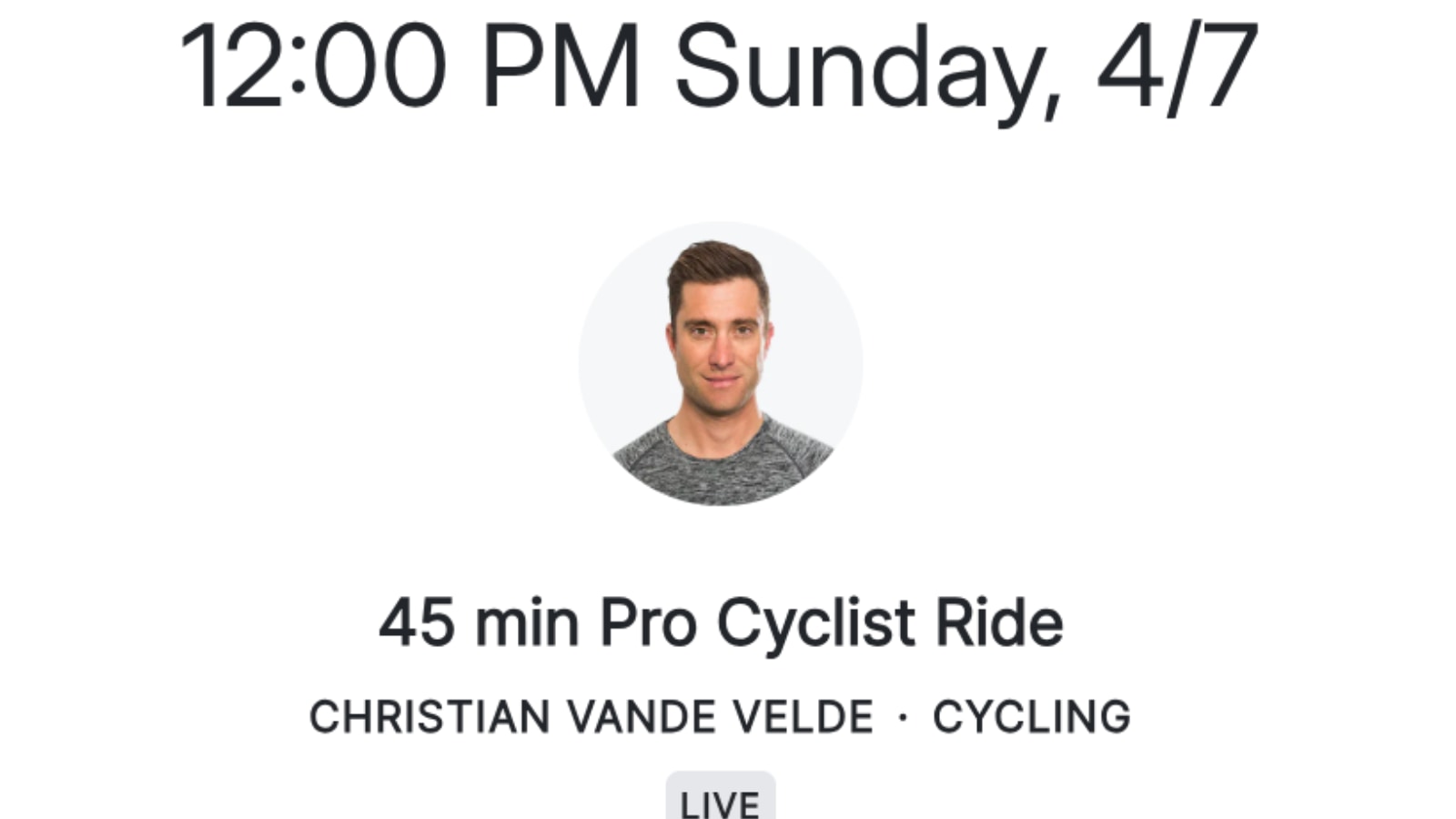 Christian Vande Velde’s first Peloton class teaching again will be a 45 min Pro Cyclist Ride on April 7th, 2024 @ 12:00pm ET.
