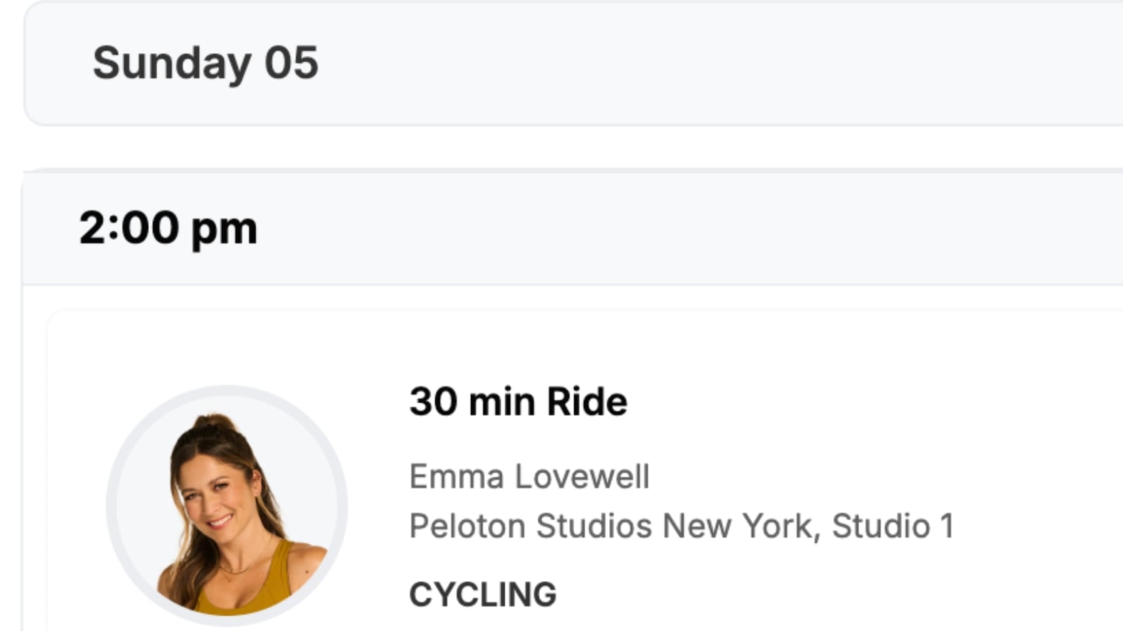 A new live class is listed on the studio booking site for 2:00 PM ET on January 5, signaling Emma’s reappearance on the live schedule. The class is a 30 minute cycling class.