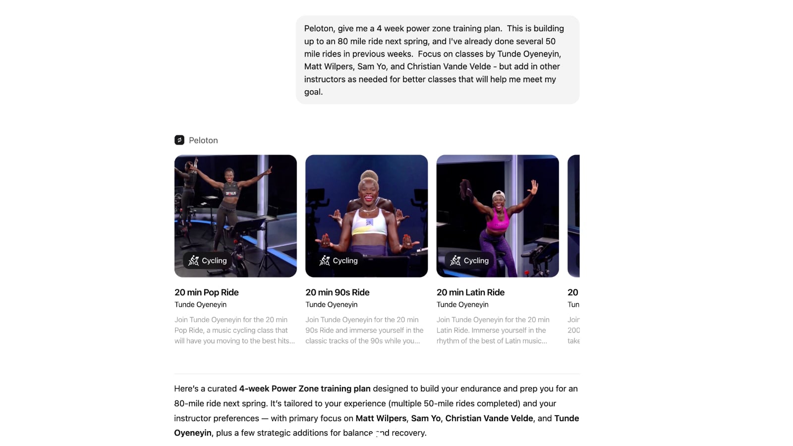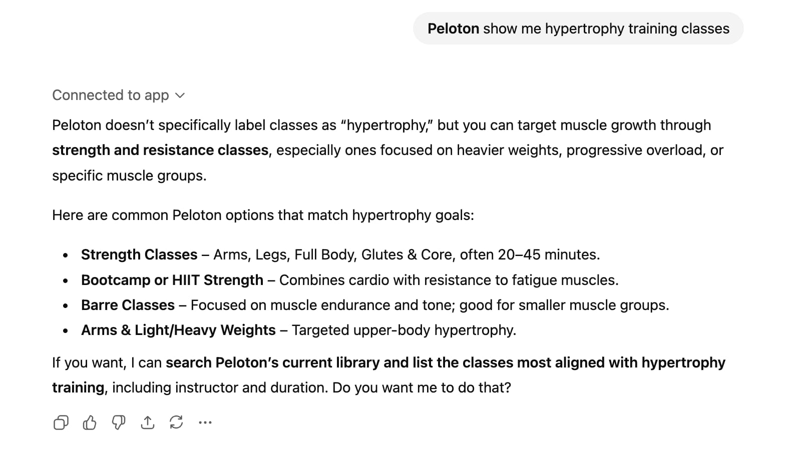 This has been an unofficial use of ChatGPT & Peloton for some time. There are numerous reports of users who used ChatGPT to help them build out a training plan of Peloton classes. The limitation, until now, has been that ChatGPT was unable to query and search for the entire library of Peloton classes and include specific classes as part of the plan. One of the goals of this integration is to now allow those same sort of plans to be built – but with specific classes and a better knowledge of the classes that will be included.