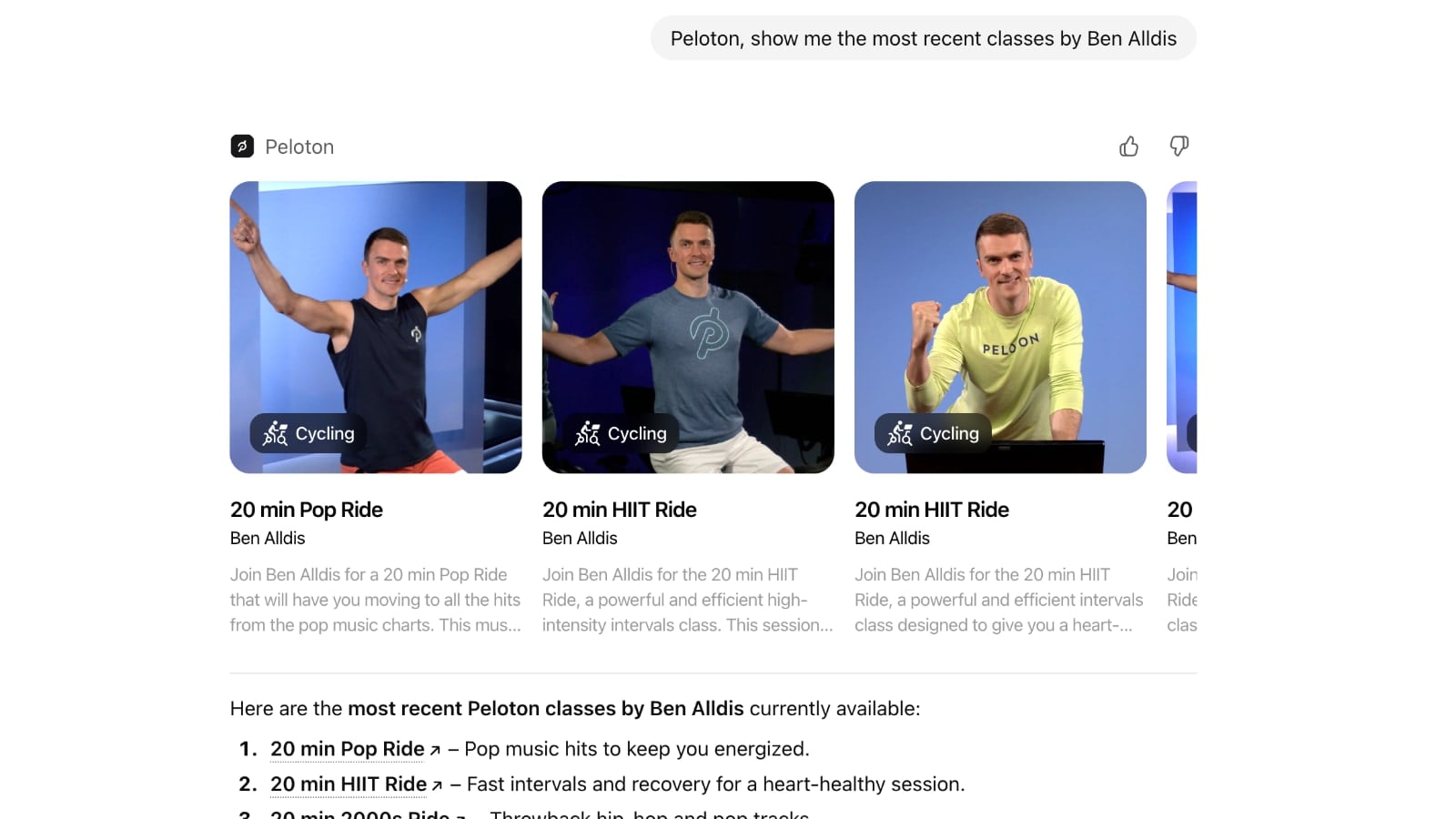 Even what should be a very simple search did not return correct results. ChatGPT was prompted to “Peloton, show me the most recent classes by Ben Alldis”. ChatGPT returned a set of Ben Alldis classes as expected.