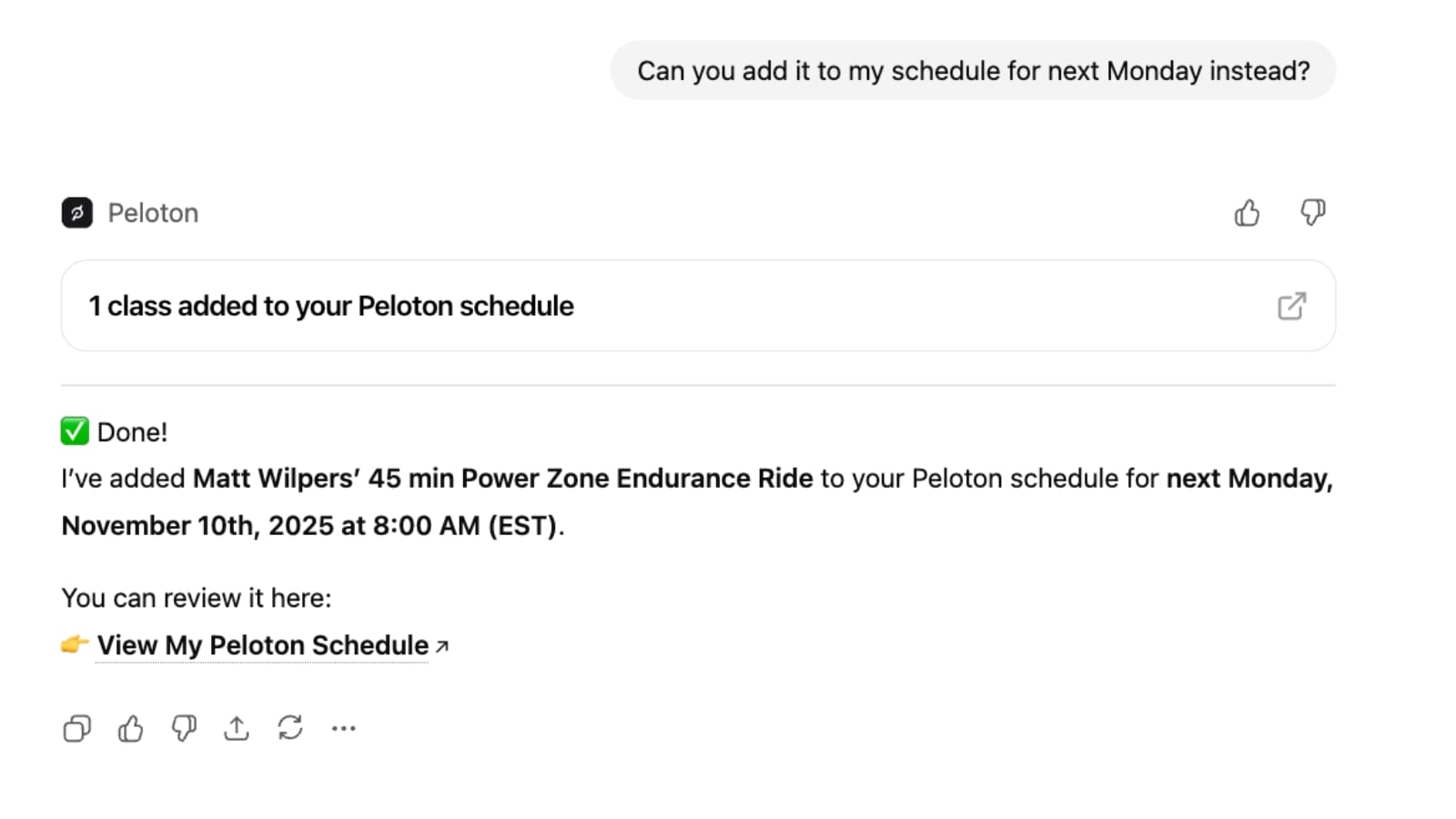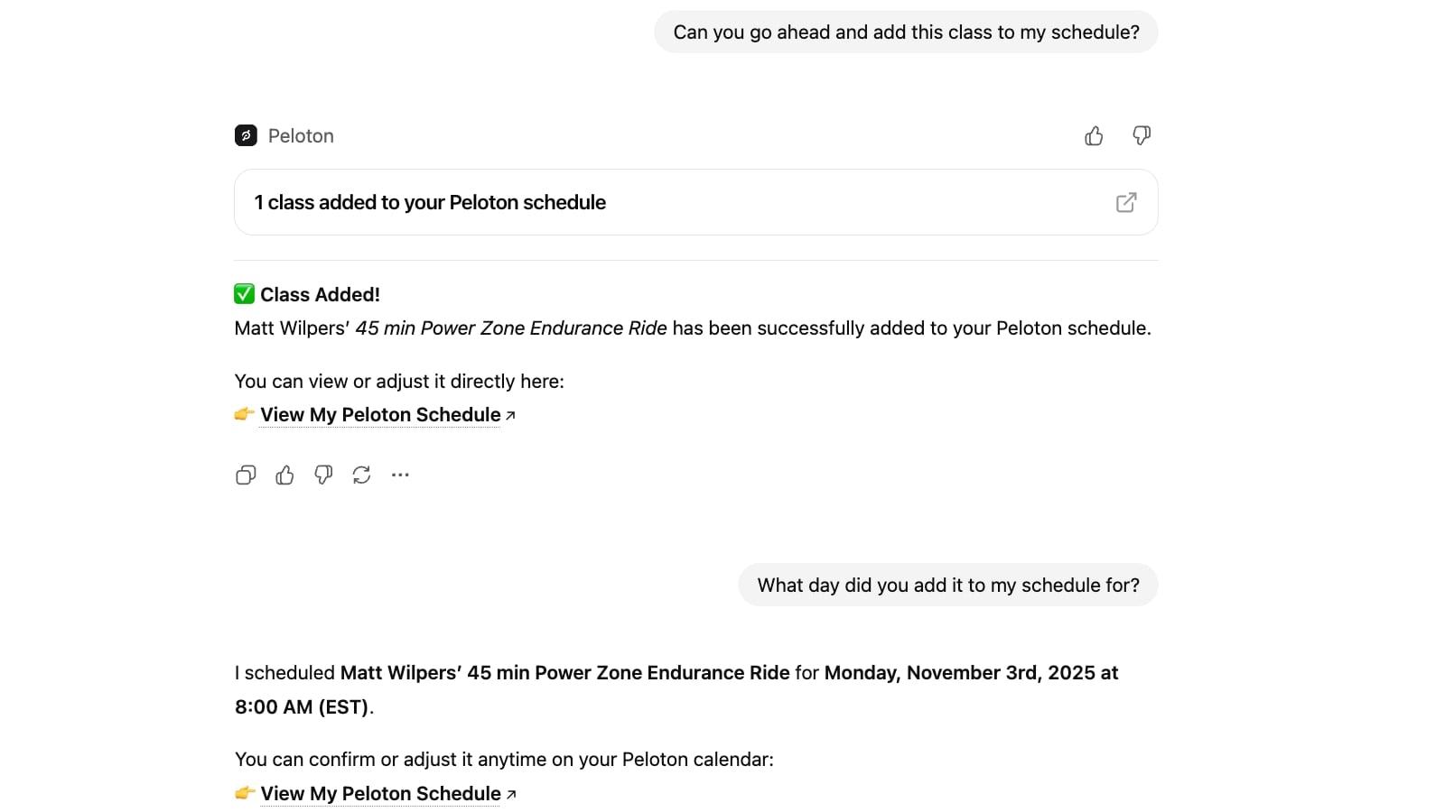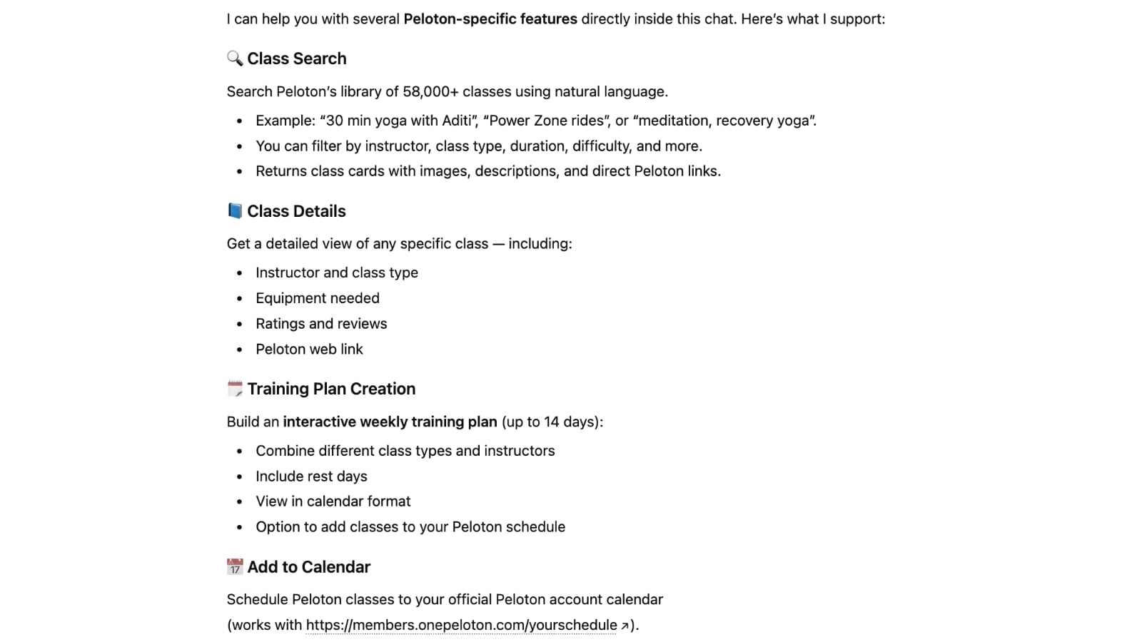 The final feature supported right now is adding classes directly to your Peloton class schedule via the ChatGPT integration. At this time, it is only possible to add to your schedule – but not to your stack.