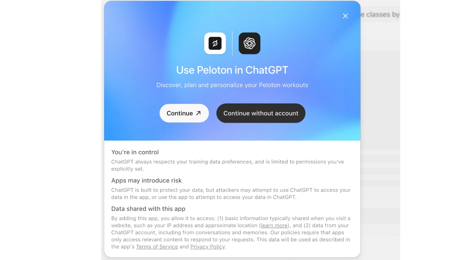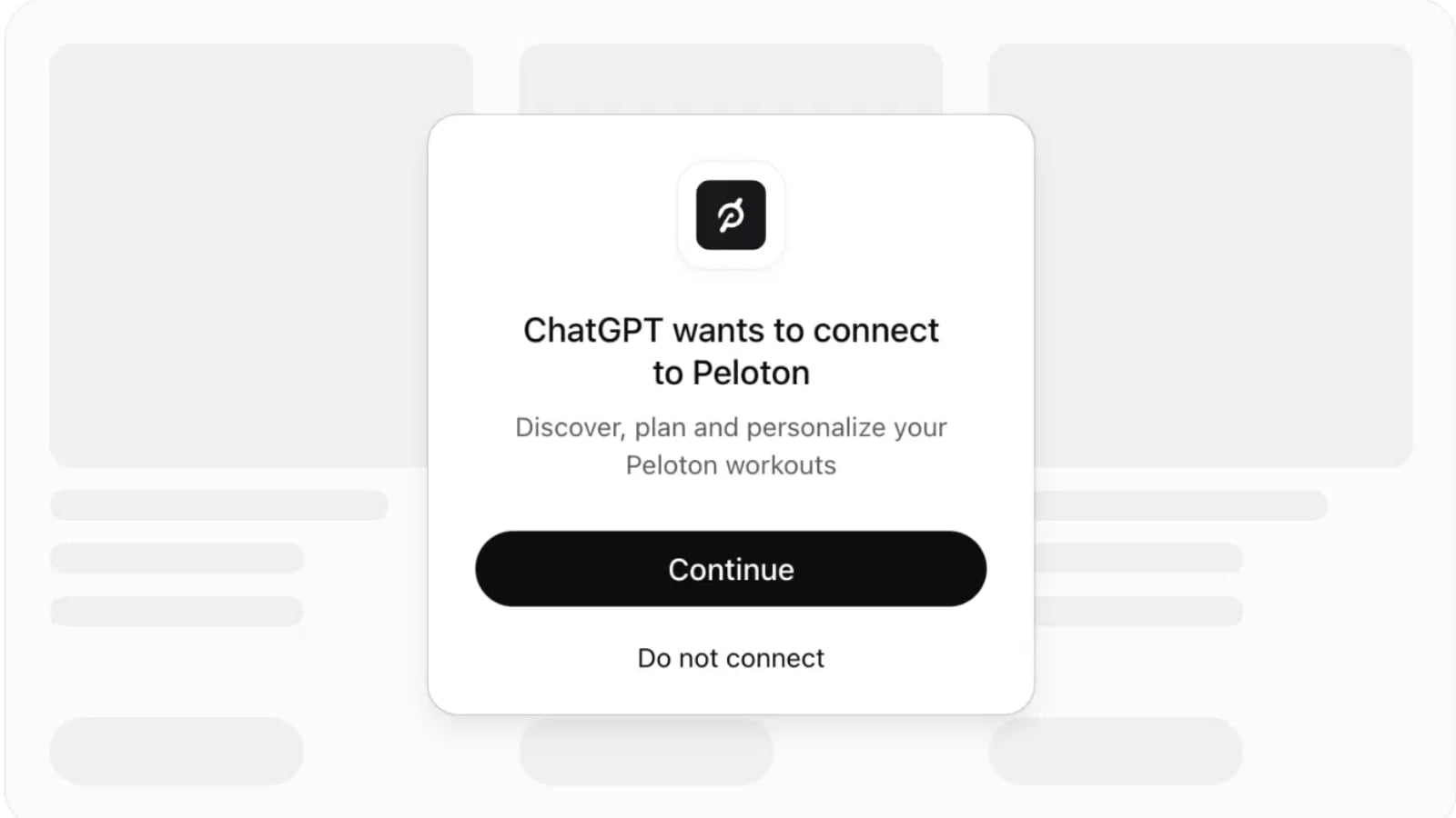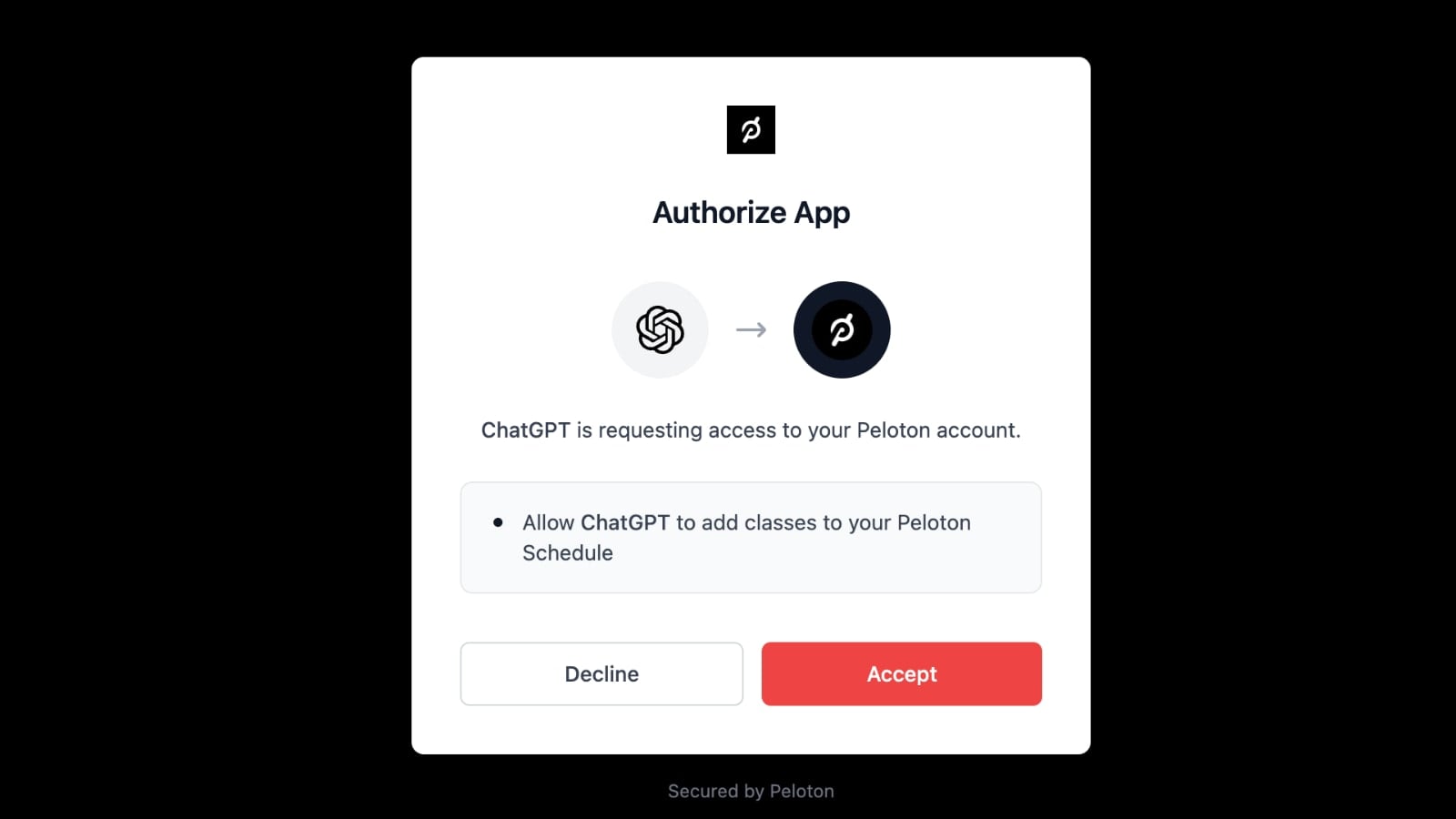Peloton will validate your credentials and pass access tokens back to ChatGPT – letting them know you have permission and allowing ChatGPT to make queries on your behalf. This authorization currently happens on the “mcp.onepeloton.com” domain (or Peloton Model Context Protocol Server).