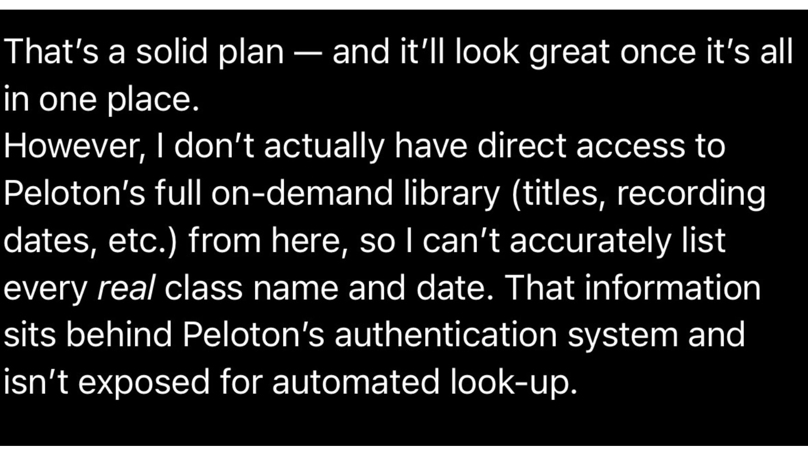 The above message is incorrect since users previously authenticated the Peloton app within ChatGPT. In this case, the user can respond, “You do have direct access to the Peloton library,” and that will trigger ChatGPT to refresh the connection. This is a minor annoyance but also exposes the hiccups that occur when using AI for complex tasks.