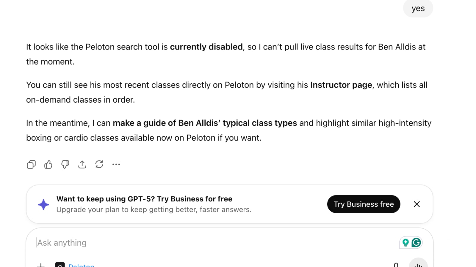 Yet another issue comes when, for some reason, ChatGPT loses its connection with the Peloton app mid-conversation, as shown here: