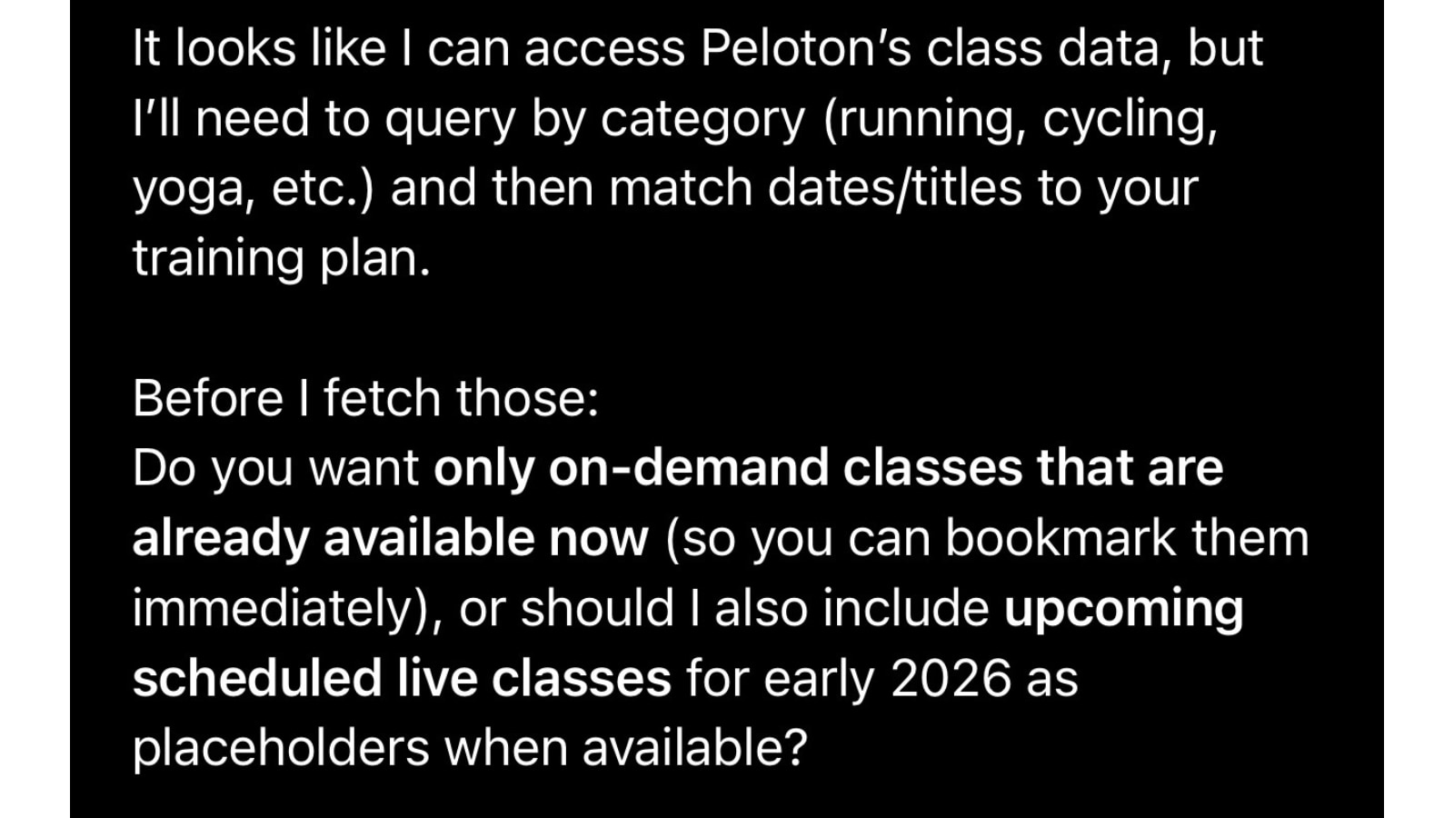 Although ChatGPT itself said it could only build “interactive training plans” of up to 14 days – it will attempt to build longer plans. After several back and forths and session timeouts, ChatGPT eventually did return a 18-week plan designed for someone with a specific target goal for the Boston Marathon. Since it was a longer plan, it did not include links to specific Peloton classes, only general class types & lengths. The issue was that it appears that several of the class titles it suggested don’t actually exist in the Peloton library.
