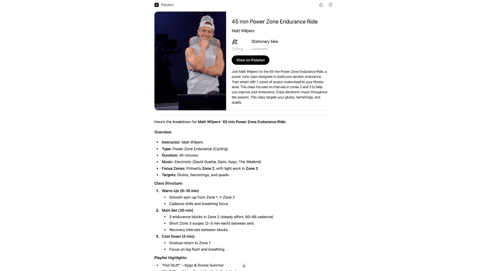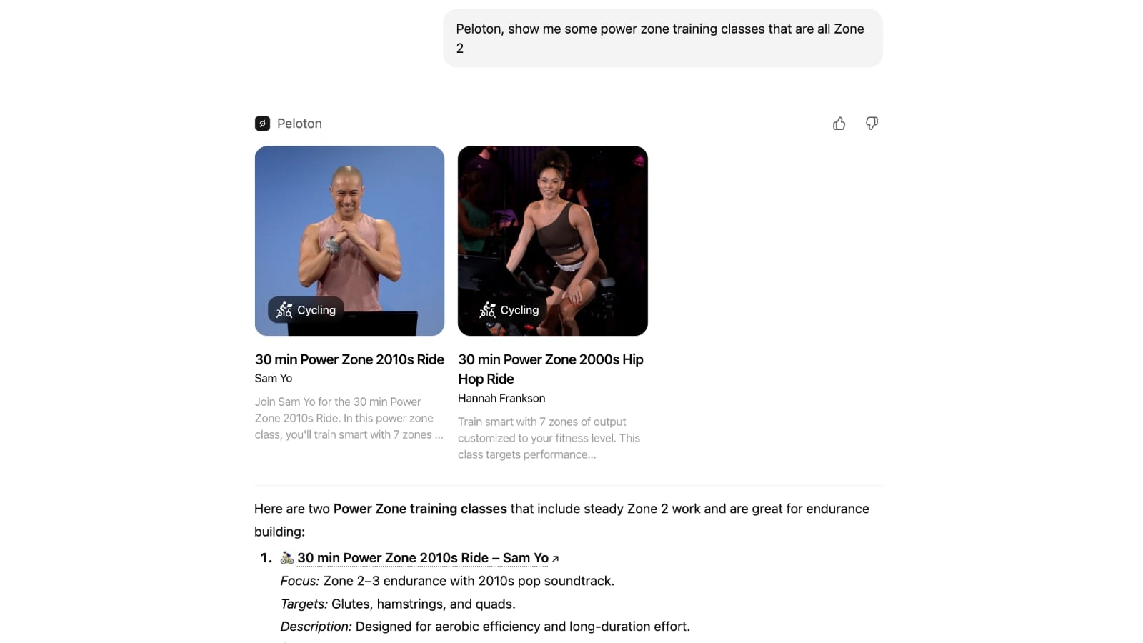 The reason for this result was that it was “likely because Peloton doesn’t tag endurance rides by individual zones in titles or descriptions” – indicating that ChatGPT is not able to, or not currently set up to, use the class structure at a more detailed level at this point of the integration.