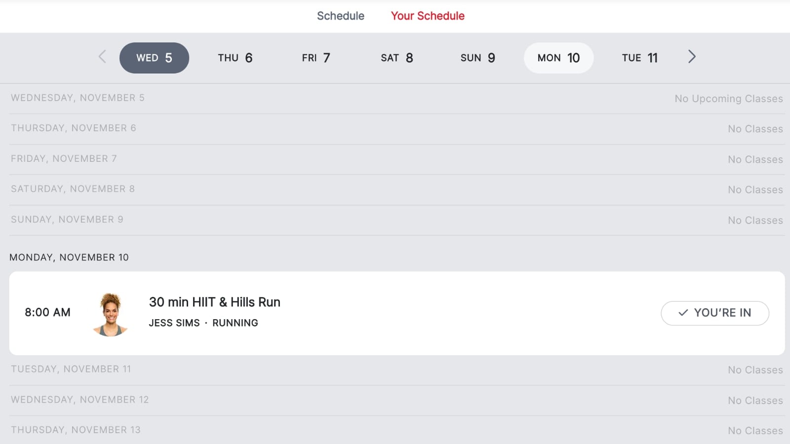 Upon opening our schedule on Peloton, we did find a class at 8:00am ET for next Monday – however, it was not the Matt Wilpers class it said it was adding, it was instead a Jess Sims running class from 2023.