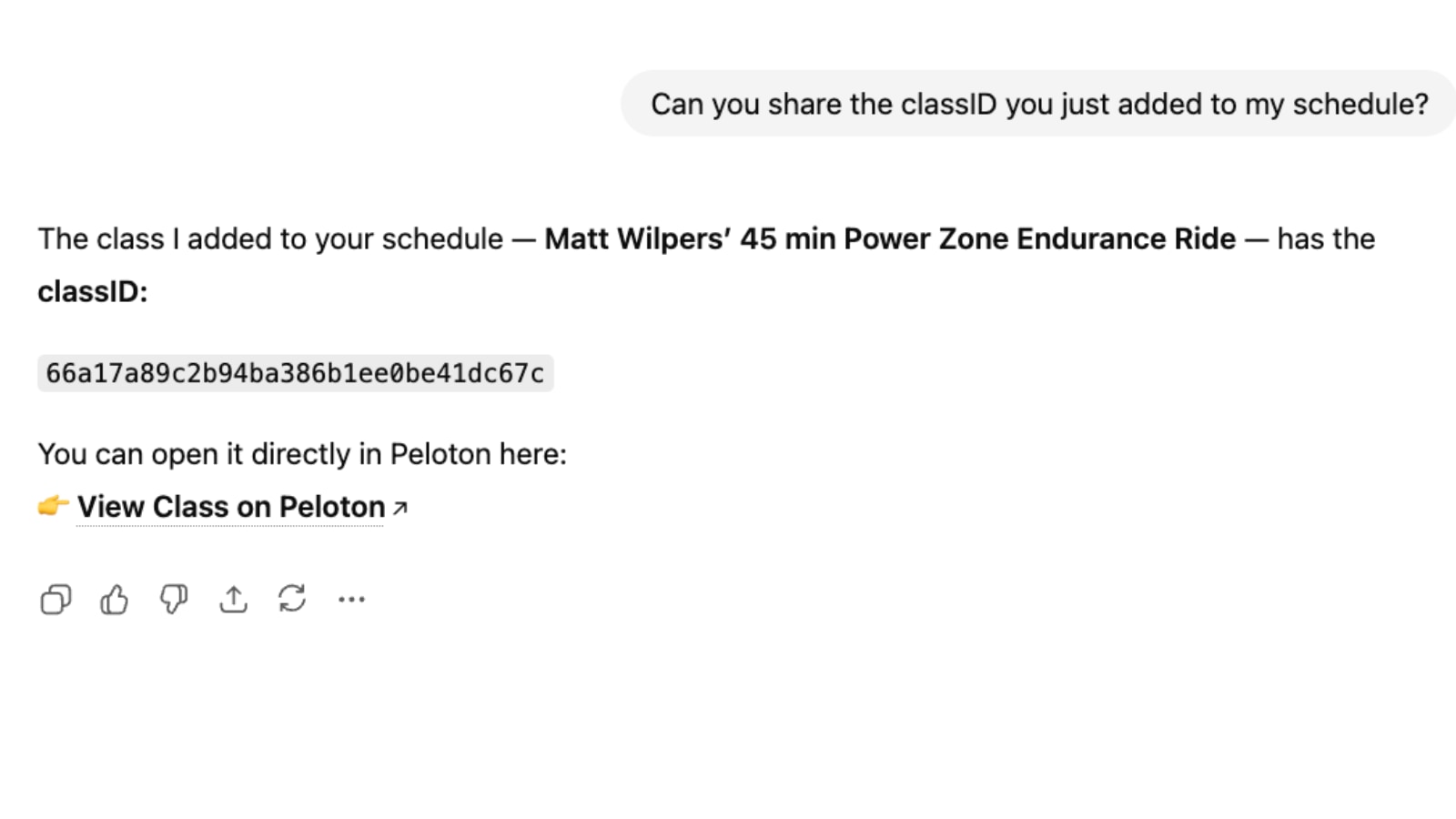 When asked to confirm what class it added to our schedule, ChatGPT replied it was the class with ID 66a17a89c2b94ba386b1ee0be41dc67c – which does link to Matt Wilpers class we were trying to add.