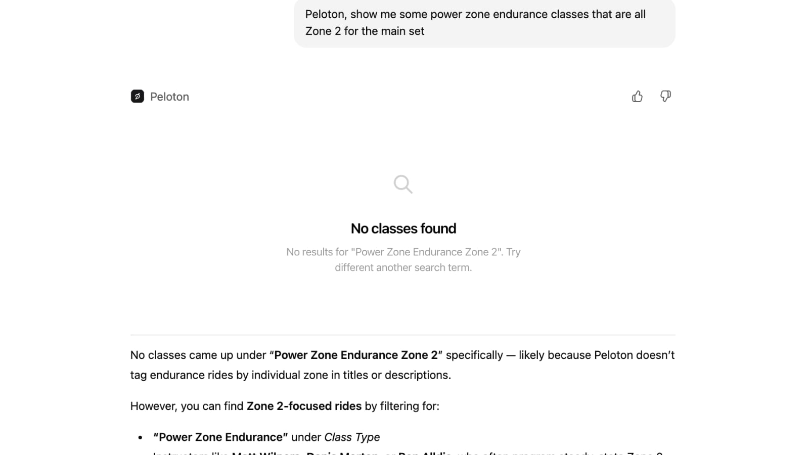 A second attempt at this same search, using the prompt “Peloton, show me some power zone endurance classes that are all Zone 2 for the main set”) ended up returning no results at all.