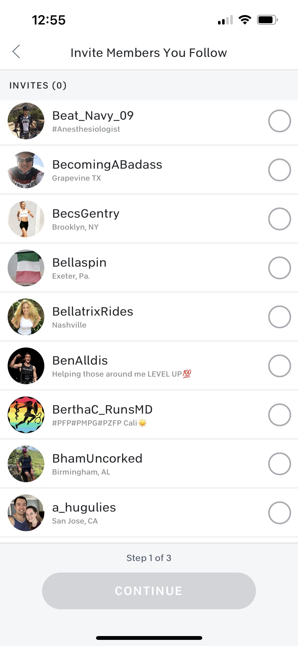 Once you click into the app, you then select which friends you want to invite. Like the Bike & Tread, there is currently no way to search or filter – you have to scroll through the list of your followers.