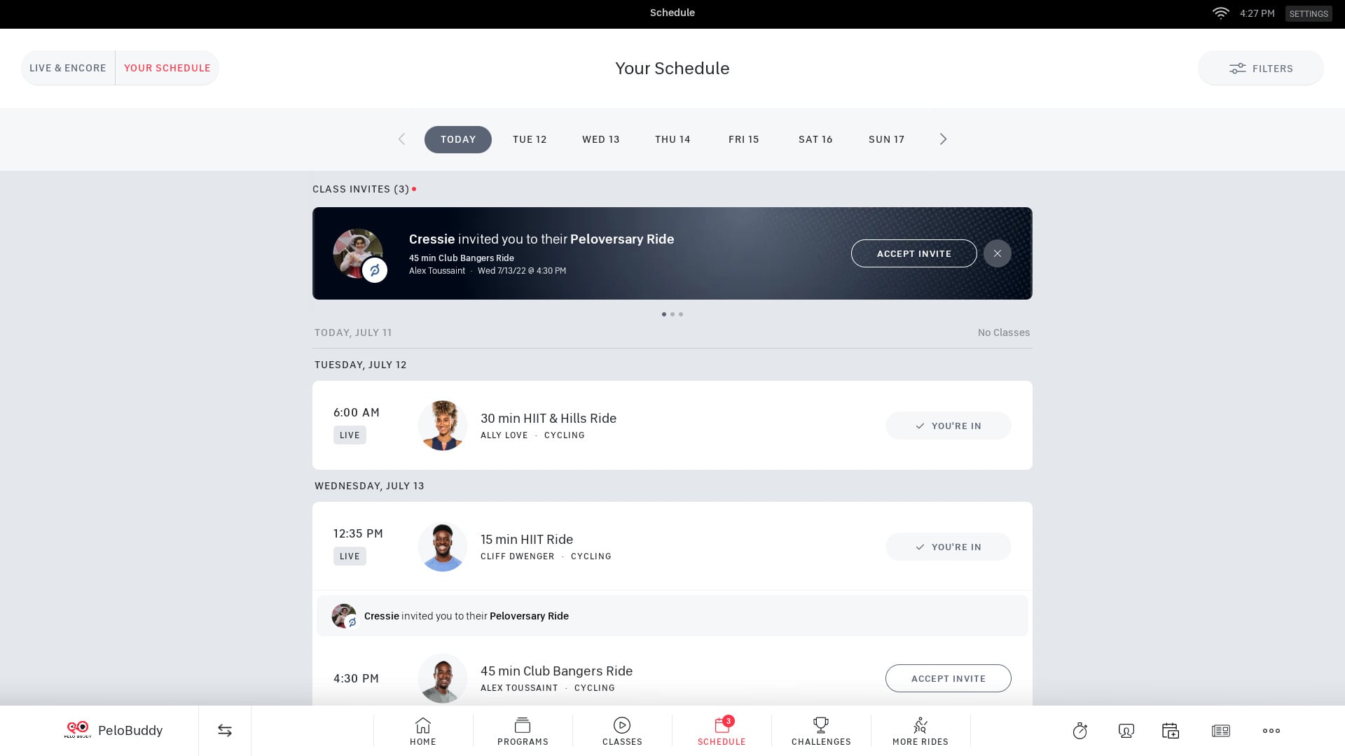 “Your” schedule on Peloton Bike showing multiple invites from friends.