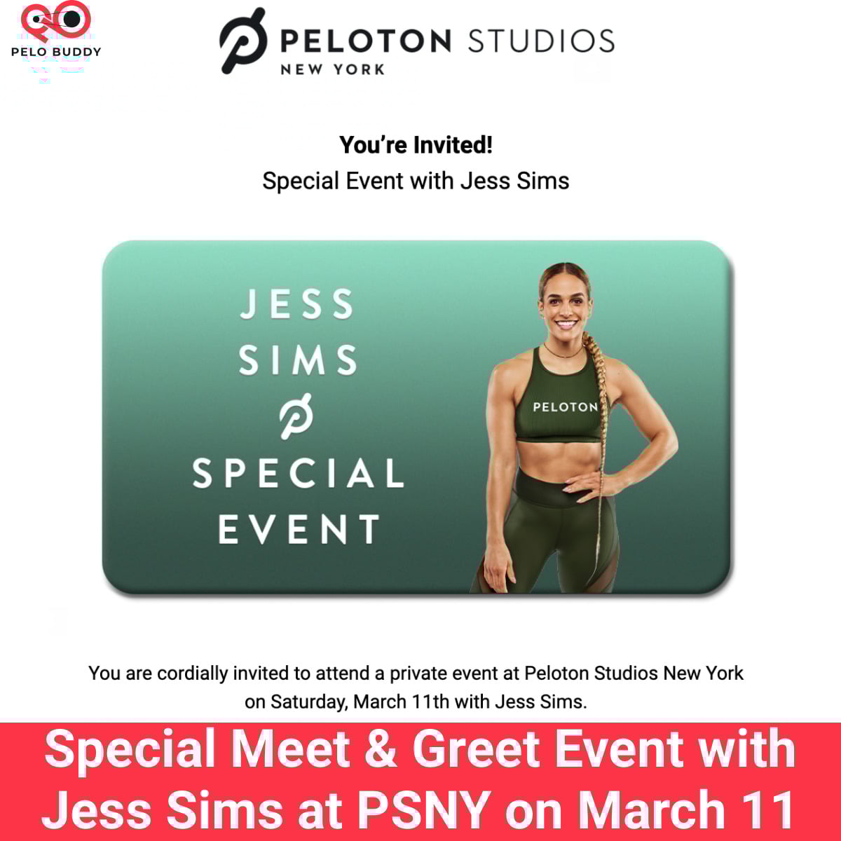 Peloton will host a private event with instructor Jess Sims at Peloton Studios New York (PSNY) on Saturday, March 11, 2023. Peloton sent an email invitation to some members inviting them to attend: