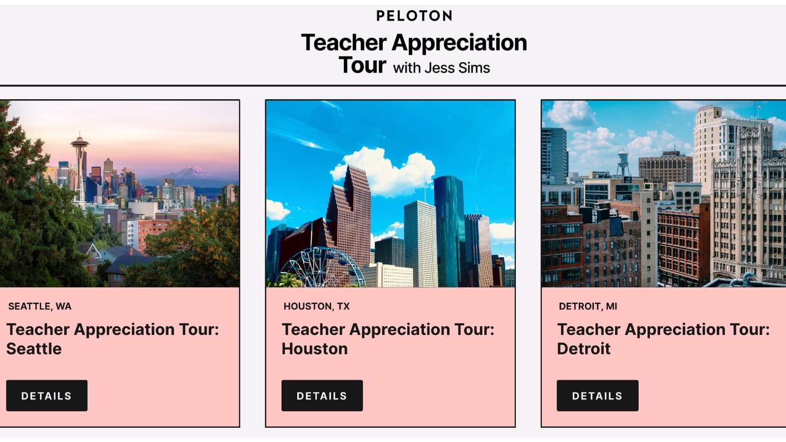 Peloton is hosting a Teacher Appreciation Tour, which features classes and meet & greets, with instructor Jess Sims, who is also a former teacher and principal.