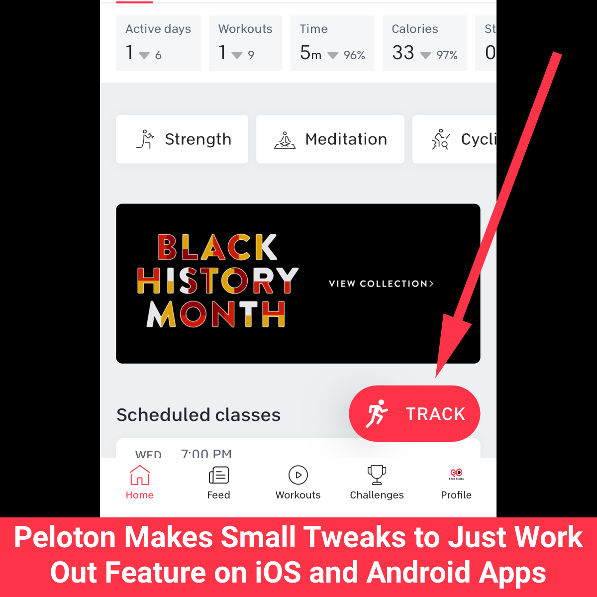 When first opening the home page of the Peloton App, the red icon for the Just Work Out feature is expanded to include the word “Track” – likely to make it more obvious what the button is for. There are still posts from members asking how they find the “Just Work Out” feature, so this update could help with that. After a few seconds the button should return to the red circle icon that members are used to seeing.