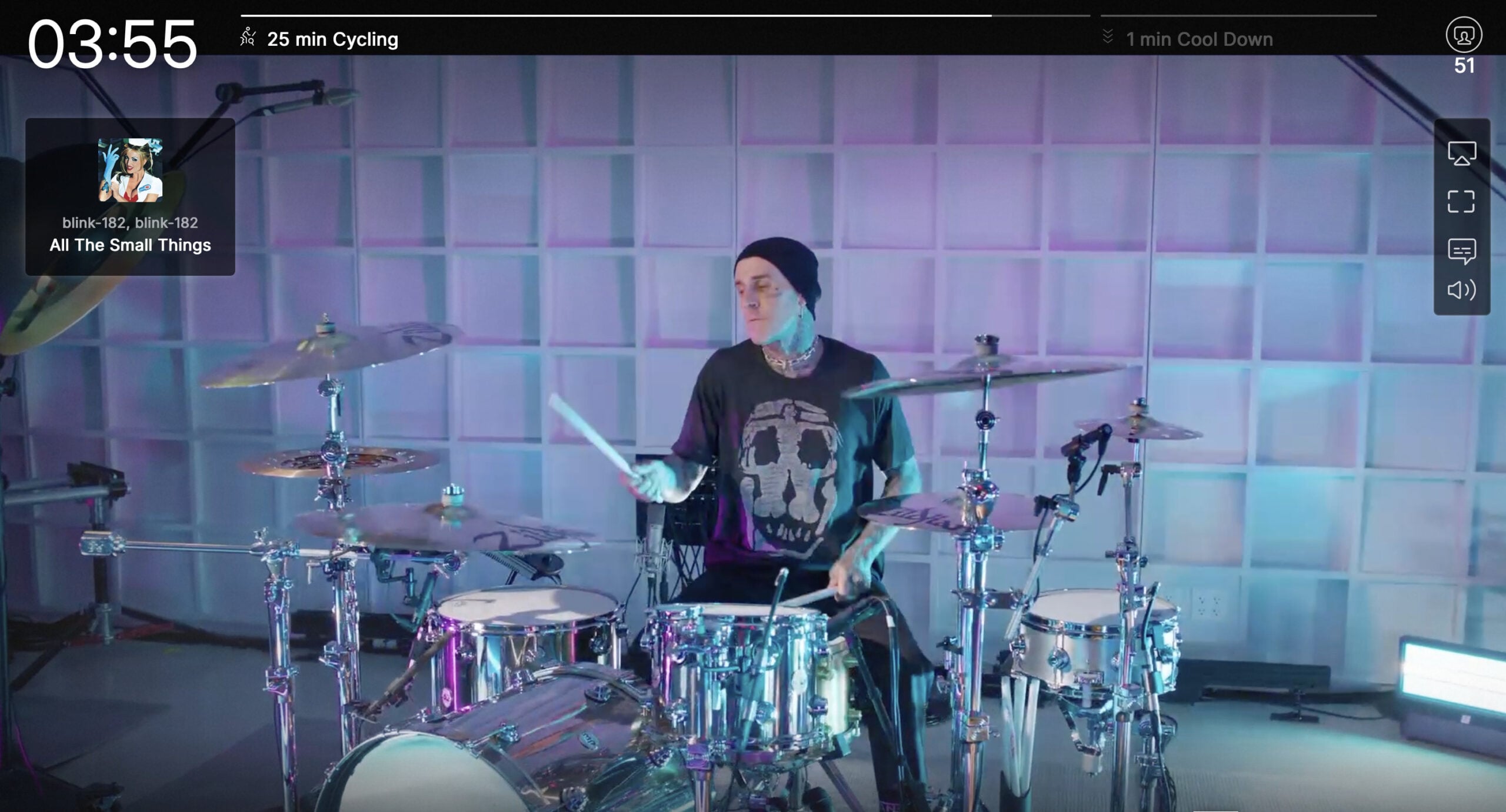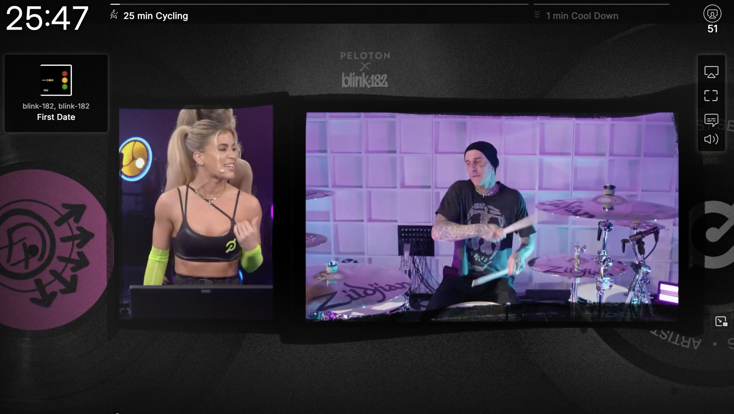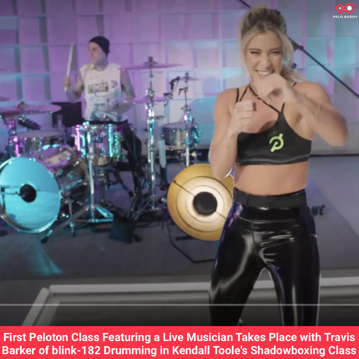 Peloton’s blink-182 artist series contained an exciting first, with a live musician performing during a class for the first time. blink-182 drummer Travis Barker joined Kendall Toole in her 10 minute blink-182 Shadowboxing Class, performing alongside her while she taught the class.