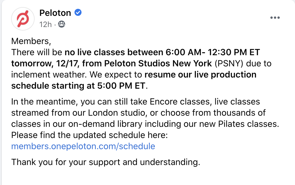 There will be no live classes between 6:00 AM- 12:30 PM ET tomorrow, 12/17, from Peloton Studios New York (PSNY) due to inclement weather. We expect to resume our live production schedule starting at 5:00 PM ET.