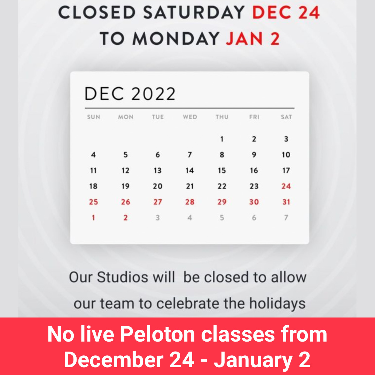 We had previously reported that the studios would be closed to the public the weekends of Christmas and New Year’s – which Peloton announced earlier than usual since members would potentially be looking to book in-person classes. However, this latest update indicates that the studios will be closed with no opportunity for live classes for a full ten days, their longest closure in recent memory.