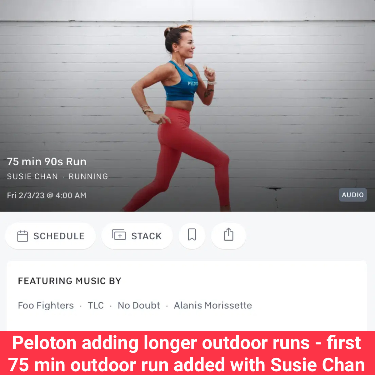 Peloton has released the first-ever 75 minute outdoor run – the longest run Peloton has ever released, whether on the Tread or audio-only. The run was released on February 3 at 4:00am ET and is a 75 minute outdoor 90s run with Susie Chan.