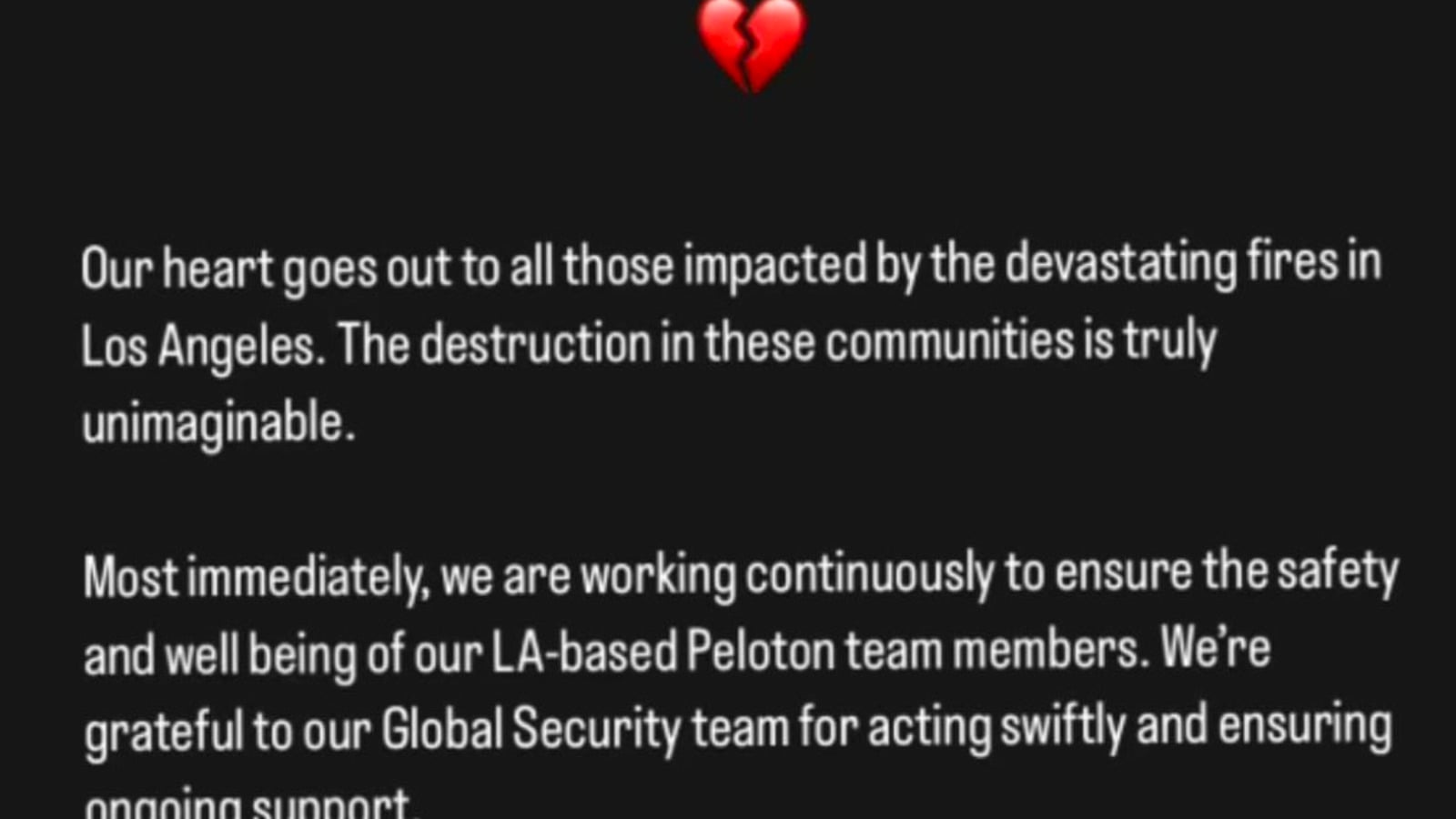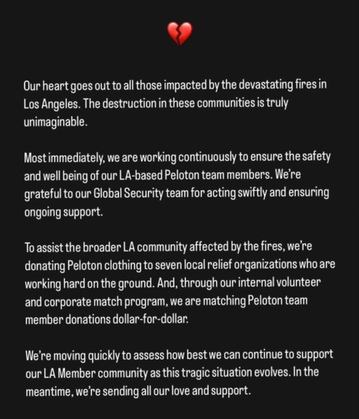 Peloton is taking some steps to support the Los Angeles, California community as they deal with the tragedy taking place brought on by the fires.