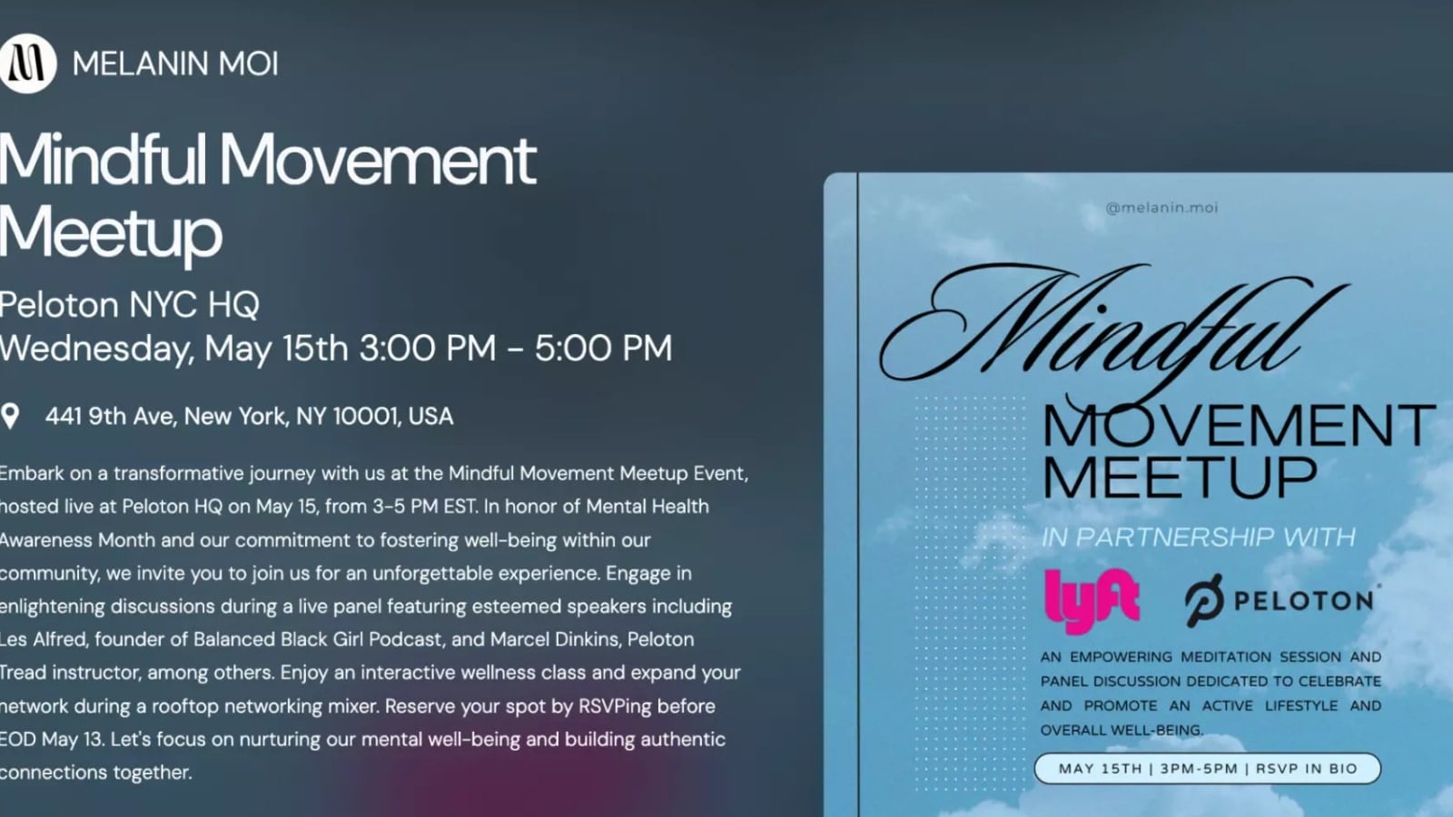 Embark on a transformative journey with us at the Mindful Movement Meetup Event, hosted live at Peloton HQ on May 15, from 3-5 PM EST. In honor of Mental Health Awareness Month and our commitment to fostering well-being within our community, we invite you to join us for an unforgettable experience. Engage in enlightening discussions during a live panel featuring esteemed speakers including Les Alfred, founder of Balanced Black Girl Podcast, and Marcel Dinkins, Peloton Tread instructor, among others. Enjoy an interactive wellness class and expand your network during a rooftop networking mixer. Reserve your spot by RSVPing before EOD May 13. Let’s focus on nurturing our mental well-being and building authentic connections together.