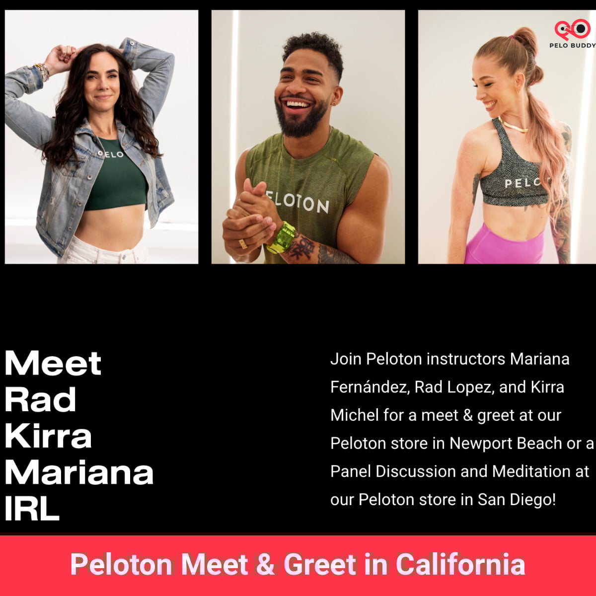 Peloton instructors Rad Lopez, Kirra Michel, and Mariana Fernández will appear at two meet & greet events in Newport Beach and San Diego, California in early December. Peloton shared the news via the @PelotonStudios Instagram Stories.