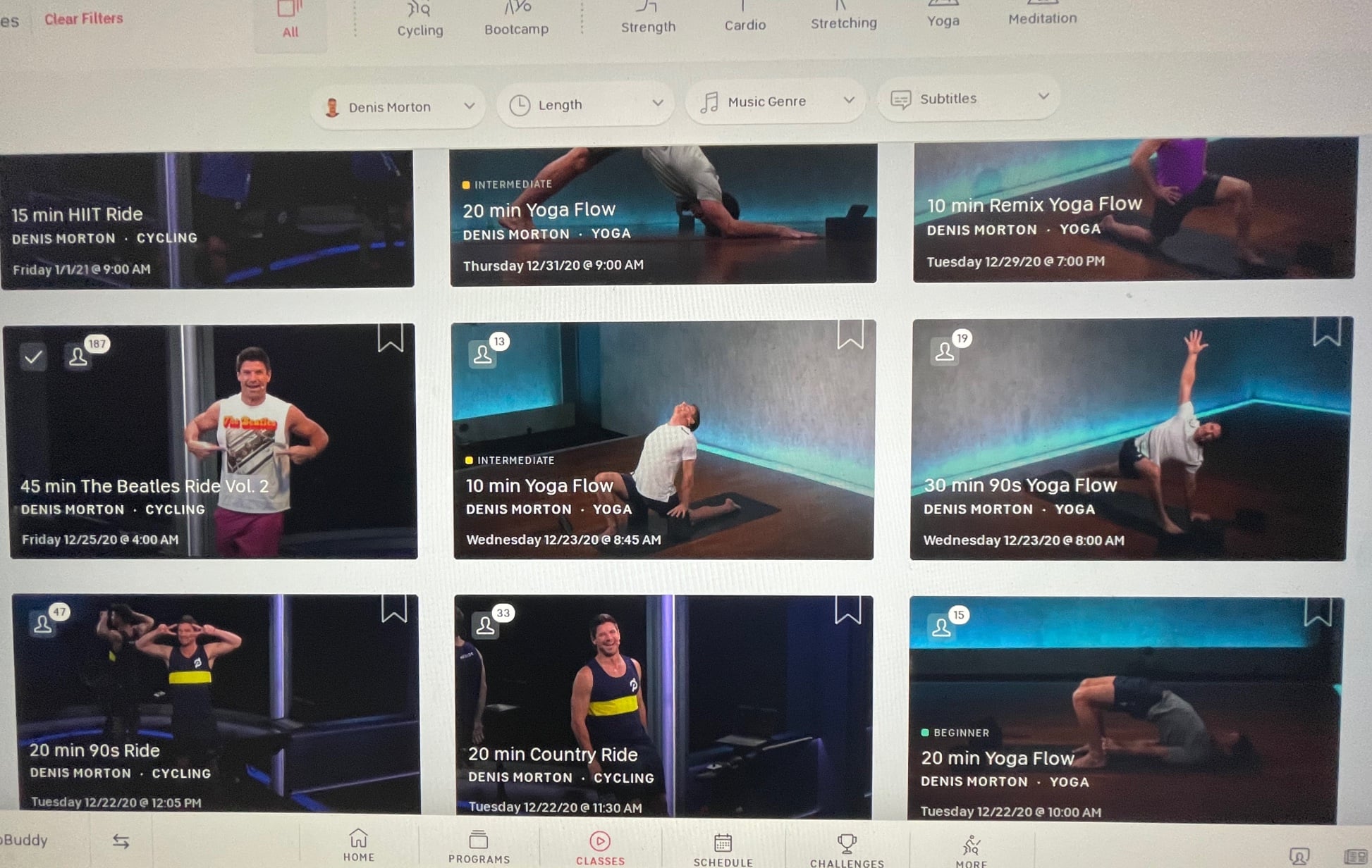 These filters work in combination with other filters and dropdowns. For example, you can view all upcoming classes of one instructor. Here, you can see Denis’ available on-demand classes, showing both bike & yoga classes.