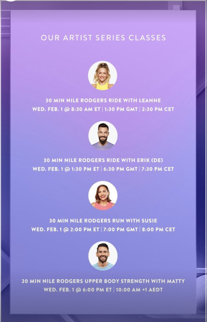 Peloton Niles Rodgers artist series class schedule. Image credit Peloton social media.