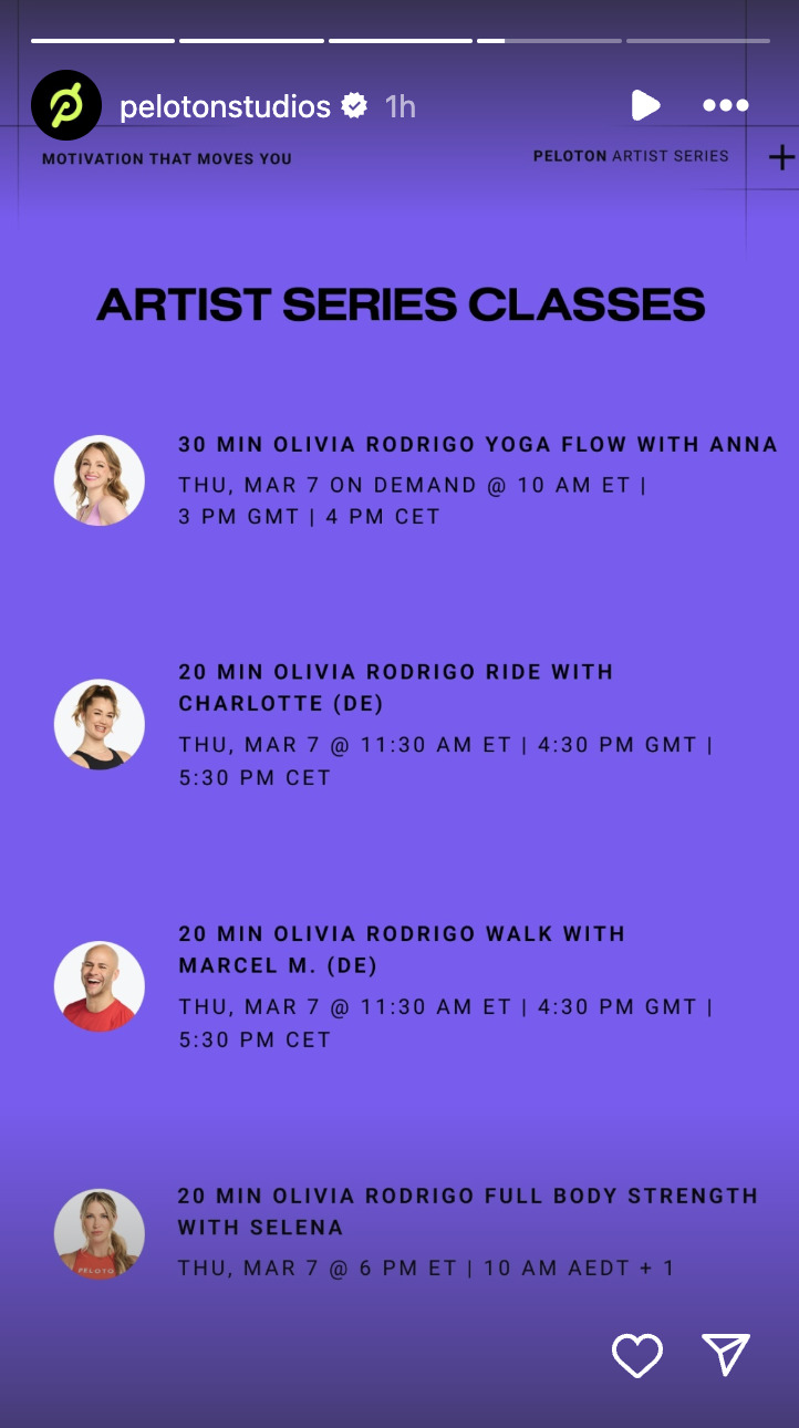You can see the full Olivia Rodrigo artist series announcement post from @PelotonStudios via Instagram.