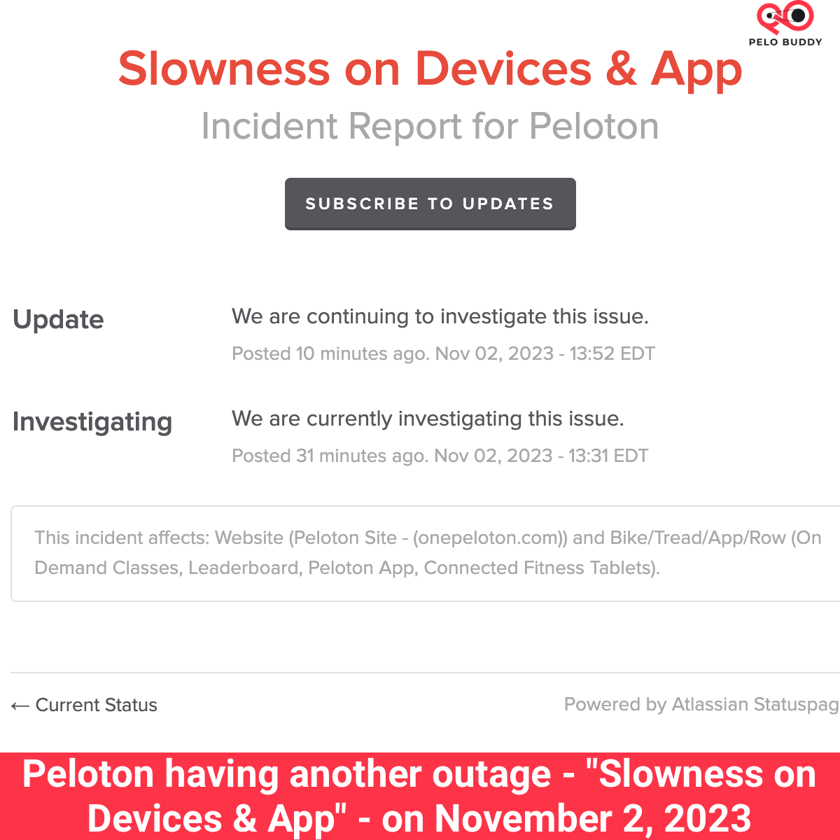 These reports started around 1:30pm ET, and Peloton created an official incident shortly after.