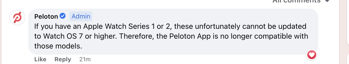 Statement from Peloton on social media about Apple Watch Series 1 & 2.