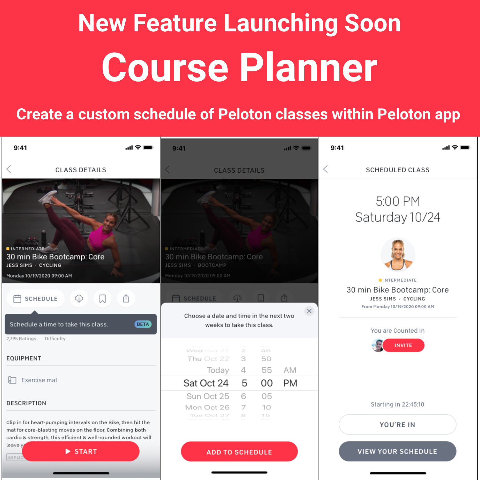 The functionality to create & schedule classes will only be available on iOS at this time – however, Peloton notes “You will receive a push notification on your iOS device and the Bike / Tread touchscreen when a planned course starts soon.”