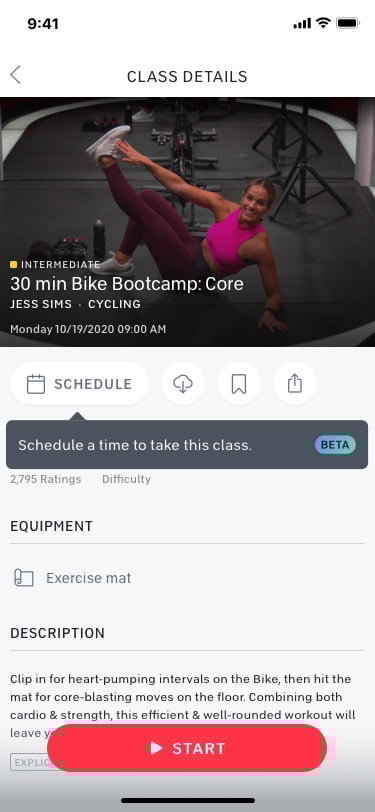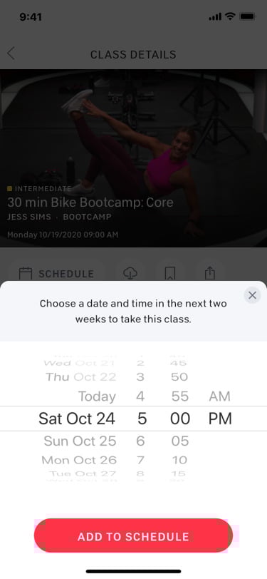 A new “Schedule” button on the class popus. Image credit Peloton.