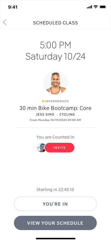 A scheduled class, with the ability to invite your friends. Image credit Peloton.