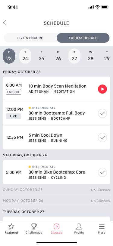 Screen showing your scheduled classes – a mix on encore, live, and on-demand. Image credit Peloton.